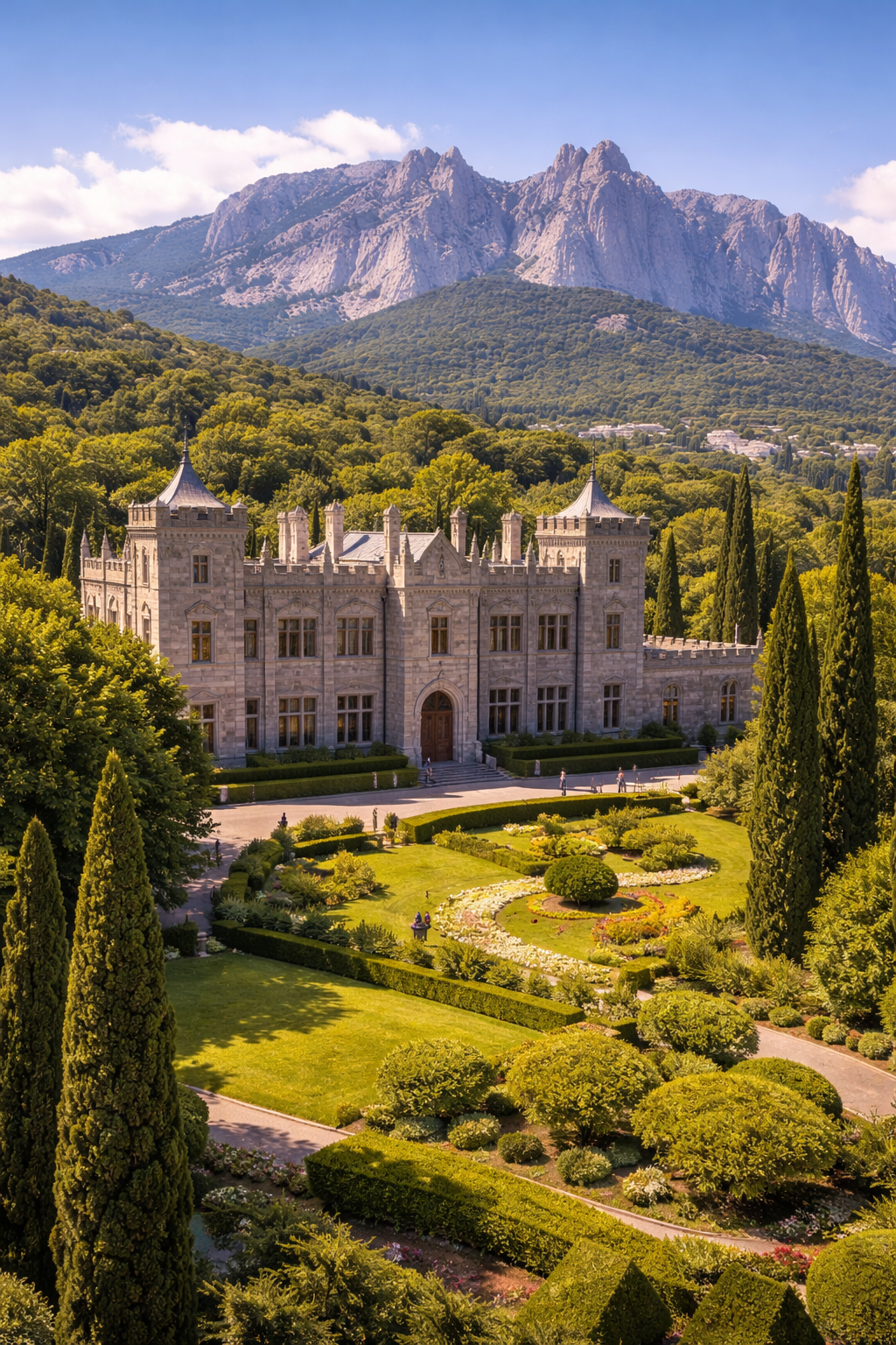 Воронцовский дворец окружен парком с кипарисами и секвойями.